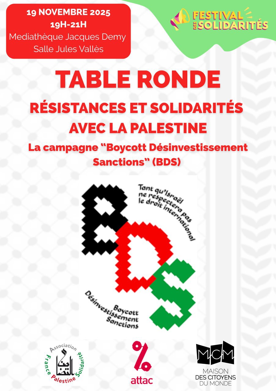 L’Association France Palestine Solidarité 44 et Attac44 organisent une table ronde autour des Résistances et solidarités avec la Palestine illustrées par les campagnes “Boycott Désinvestissement Sanction"(BDS) et "Banques complices"